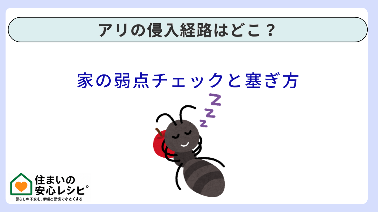 アリの侵入経路対策は、穴探しではなく、機能している入口を特定する作業です。列を逆に辿って入口候補を印付けし、床の道路を洗剤で消し、玄関・サッシ・配管・エアコン配管穴・巾木・換気口など、弱点を順に点検して、剥がせる方法で封鎖していく。これを段階的に行うほど、無駄な施工が減り、再発率が下がります。