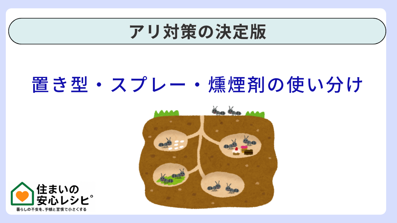 この記事では、アリ対策の代表格である置き型(ベイト剤)・スプレー・燻煙剤を、「どれが一番強いか」ではなく「何の目的に使うか」の軸で整理します。さらに、失敗しやすいNG例、子ども・ペットがいる家の安全設計、戸建てと賃貸の分岐、そして自力かプロ依頼かの判断基準まで網羅します。読み終えたら、あなたの家に最適な“作戦”が組めるようになります。
