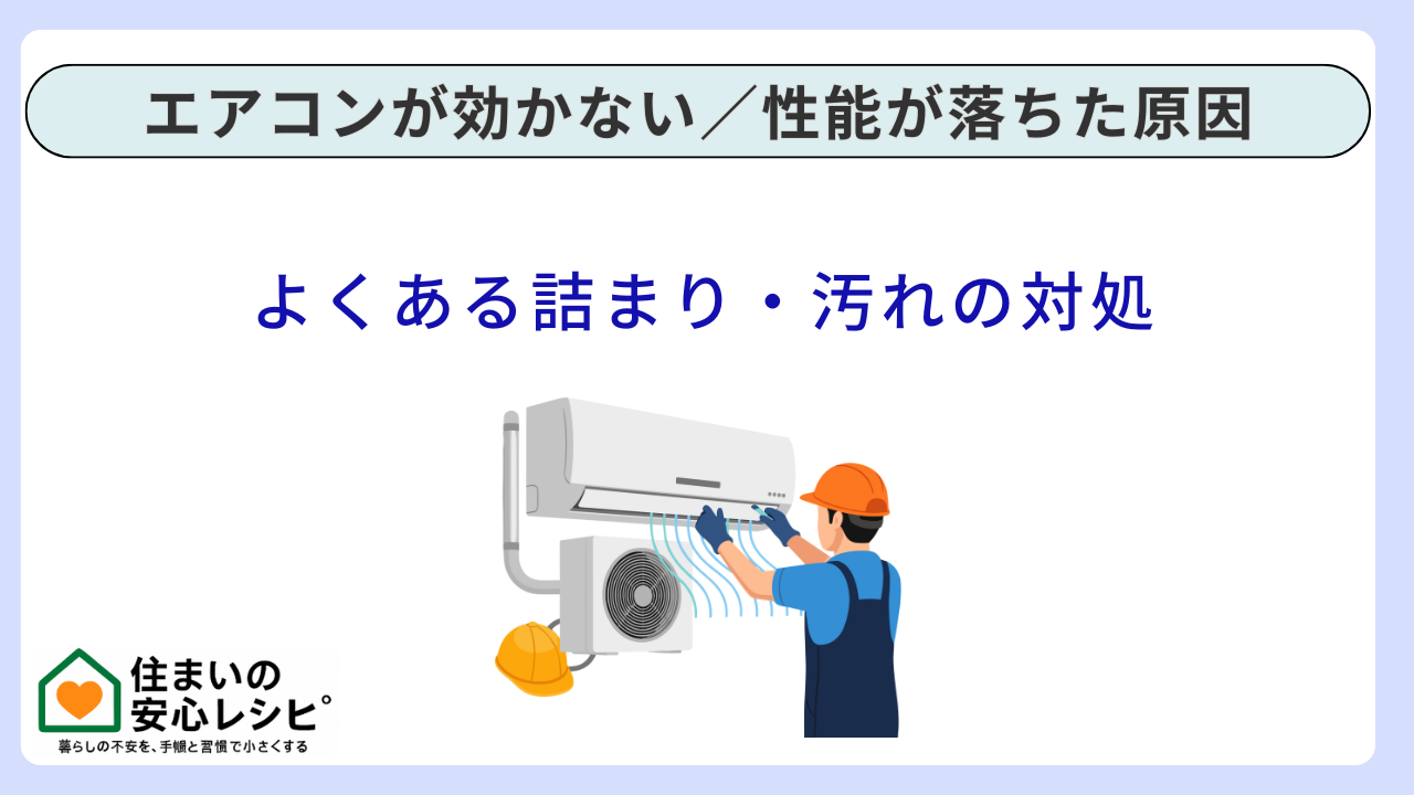 エアコンが効かない・性能が落ちたとき、最初に疑うべきはフィルター目詰まりと室外機環境です。ここはDIYでも改善しやすく、費用対効果が高い領域です。次に、吸い込み口の汚れ、室外機フィンの埃、排水(ドレン)の詰まり気配を確認し、改善を評価は数字(15分)で行うと迷いません。