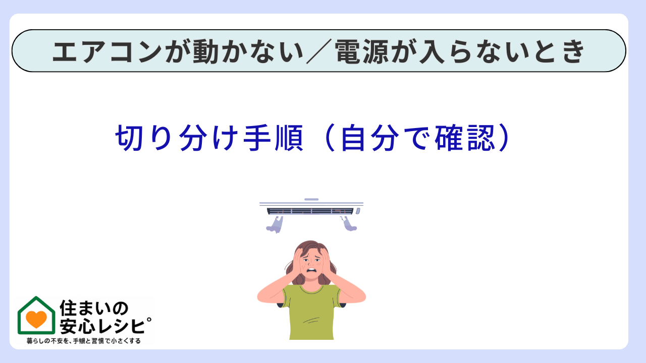 エアコンが動かない/電源が入らないとき、最初にやるべきことは、焦って操作を連打することではありません。第一に、焦げ臭さ・発熱・火花・繰り返しブレーカー落ちといった危険サインを除外します。第二に、リモコン電池交換と赤外線チェック、室内機ランプの観察、専用ブレーカーの入れ直し、応急運転ボタンなど、安全にできる切り分けを順番に進めます。第三に、それでも直らない場合は、記録した情報をもとにプロへ相談し、無駄な時間とリスクを減らします。