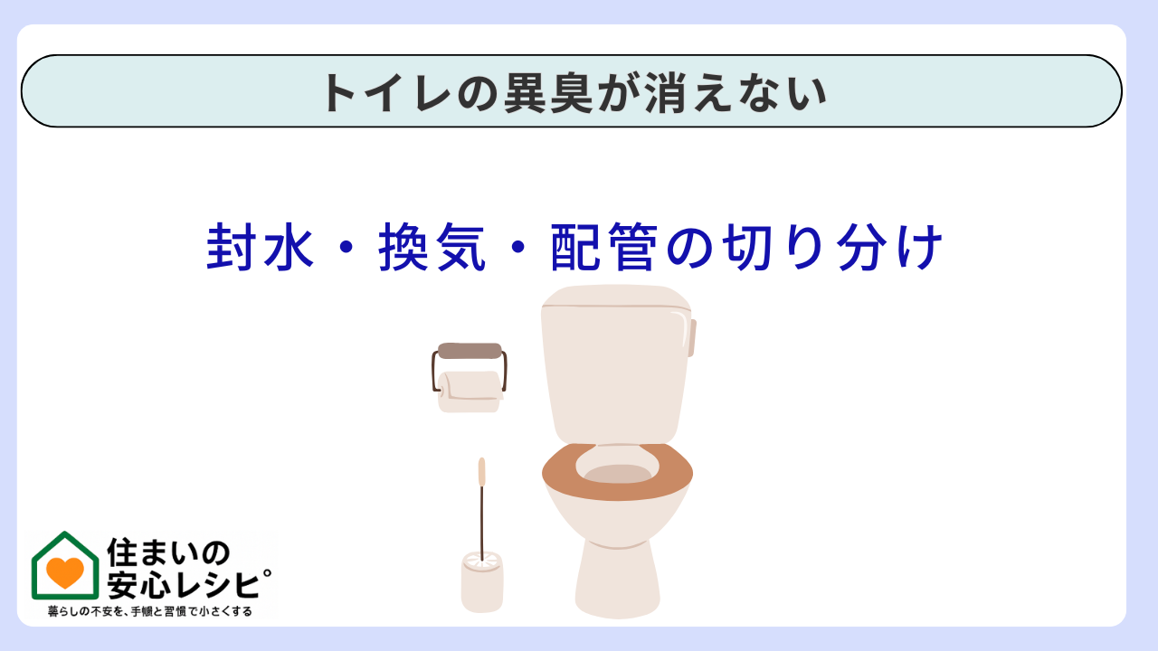 ただし、ここで大事なのは“原因を当てずっぽうで潰しに行かないこと”です。トイレの異臭は、封水(ふうすい)・換気・配管(排水・通気)・便器まわりの汚れなど、複数の系統が絡みます。順番を間違えると、時間もお金も無駄になりやすいのがこのトラブルの厄介な点です。