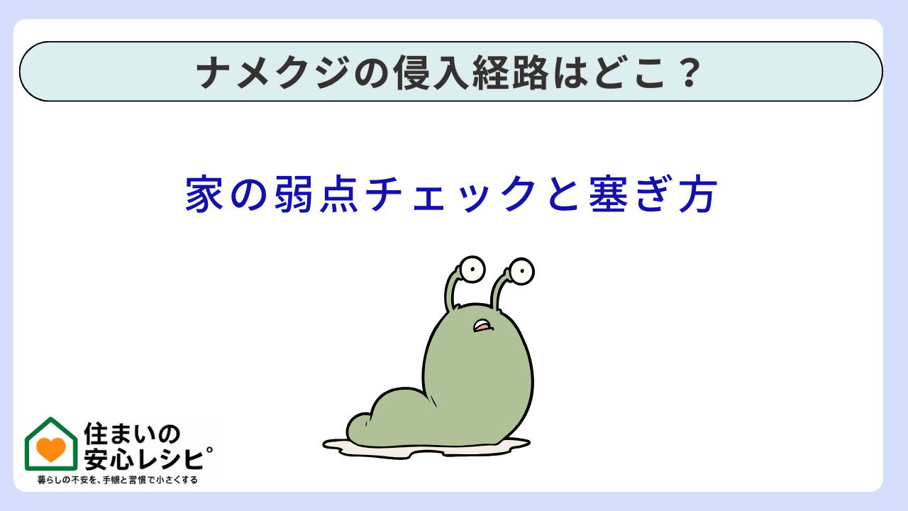 | 玄関ドア下・たたきの隙間 | 雨の翌日に出やすい、外から内へ粘液の線が続く | タオルで仮封鎖→ドア下ブラシ(ドアスイープ)検討 |