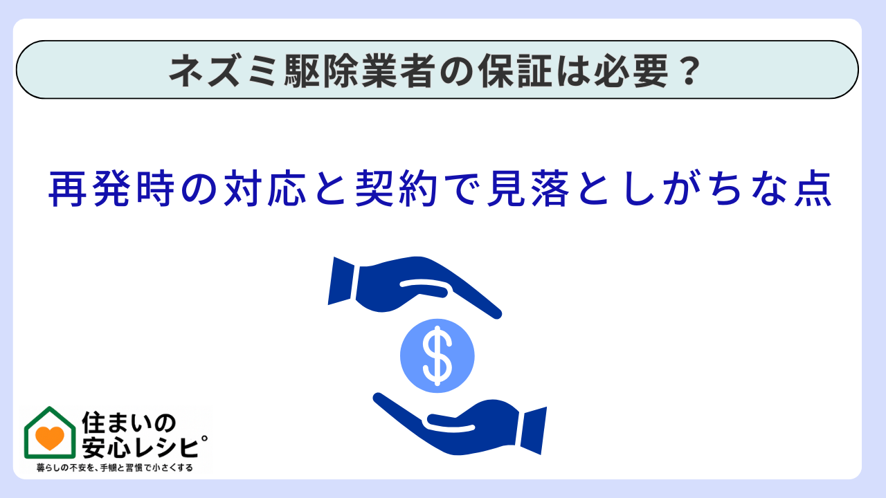 ネズミ駆除の保証は、付ければ安心という単純なものではありません。重要なのは、保証の対象範囲・条件・免責が、あなたの家の再発リスクに合っているかです。