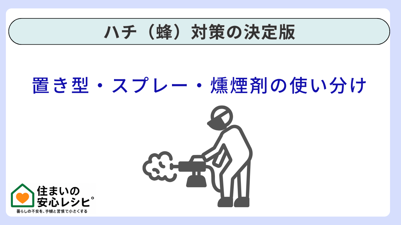 ハチ対策は、怖さのあまり“強い薬”へ飛びつくほど、失敗しやすい分野です。結論としては、置き型は「寄りつき・下見」を減らすための環境設計、スプレーは「今そこにいる個体」へ即効で対応する切り札、燻煙剤は「室内空間」の管理に向く手段です。つまり、3つは同じ土俵ではありません。