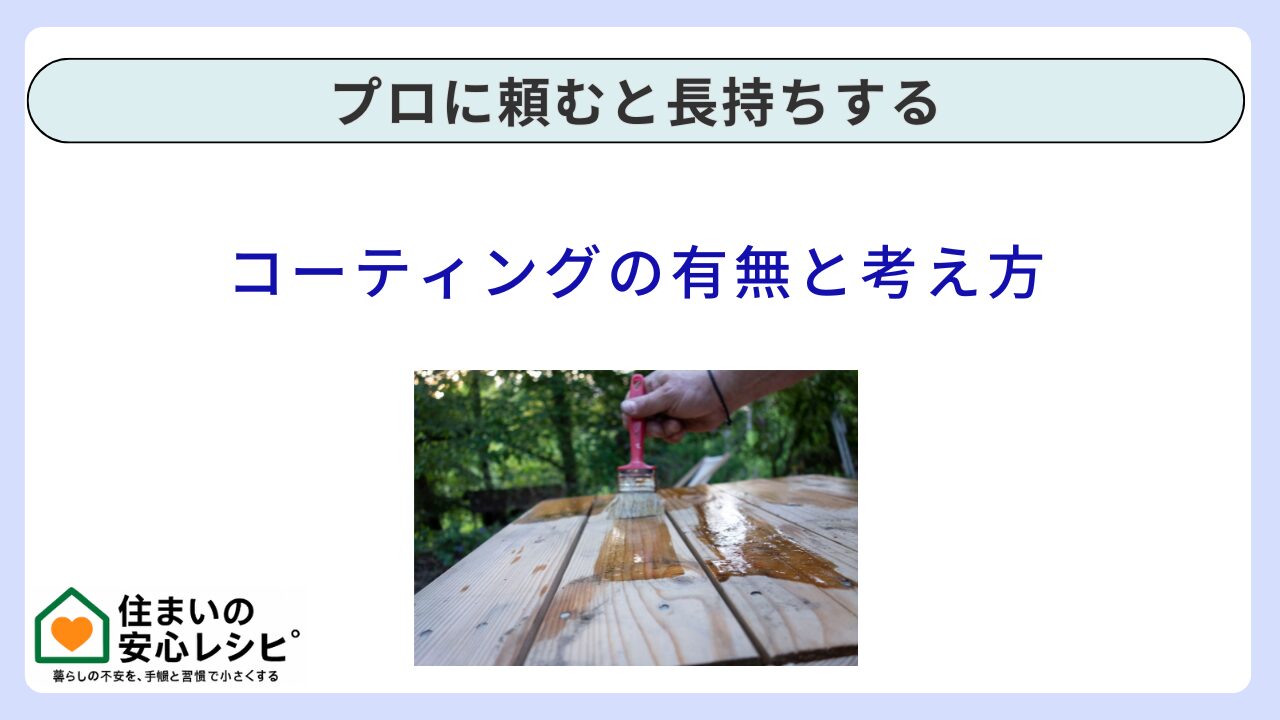 | メリット | 小範囲の試行に向きます。自分の家の汚れの性質を理解でき、日常メンテの質が上がります。 | 下地調整と仕上げが安定しやすく、結果として「掃除の頻度」または「掃除の負担」を減らせる可能性が高いです。 |