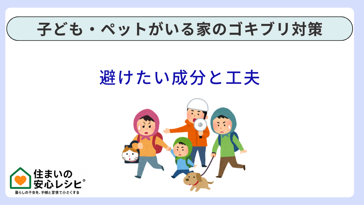 子ども・ペットがいる家のゴキブリ対策は、強い薬を探すほど難しくなりがちです。勝ち筋は、入口を塞ぎ、夜間の誘引を減らし、必要ならベイトを隔離して運用し、スプレーや燻煙は最小限に抑えることです。避けたいのは、特定成分を“悪者”にすることより、床に残す、むき出しで置く、換気と拭き取りを省くといった事故が起きやすい運用です。