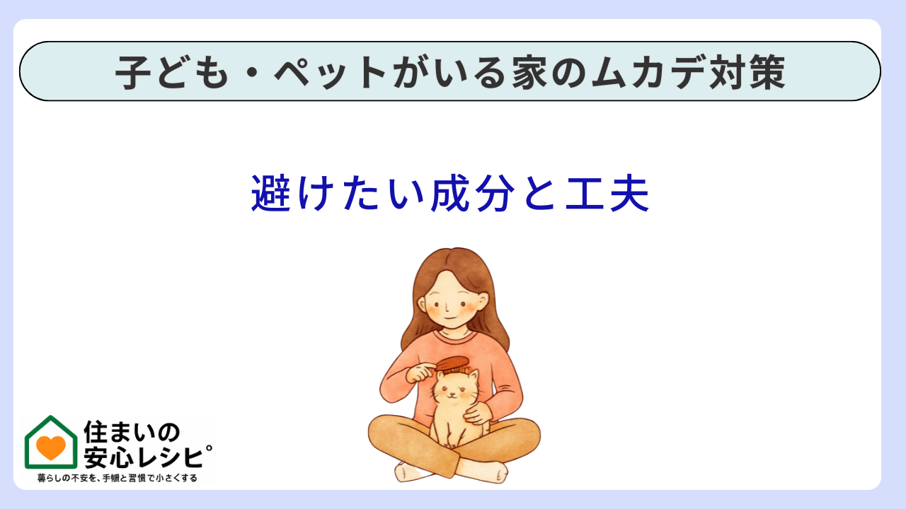 もちろん、世の中の製品は適切に使えば安全性を考慮して作られています。しかし、家庭内の現実は、子どもが床を触る、ペットが予想外の場所を舐める、換気が不十分になる、といった想定外が起きやすい環境です。したがって、薬剤で勝負する場合でも、成人だけの住まいより慎重に、「より低曝露な運用ができる系統・剤形」を選ぶ方が合理的です。