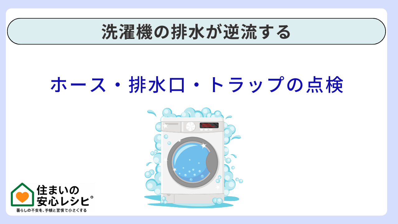 第二に、落ち着いて対処できるのは、①逆流はするが少量で洗濯パン内で収まる、②水位が一時的に上がるだけでしばらくすると引く、③ニオイはあるが漏水はない、④排水フィルター掃除をサボりがちで汚れ要因が思い当たる、こういったケースです。この記事はこの両方をカバーしつつ、「ホース」「排水口」「トラップ」「排水管の詰まり」まで段階的に切り分け、自分でできる範囲と、プロに任せる境界線を明確にします。
