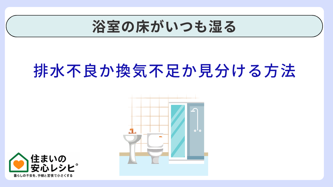 さらに、戸建てで注意したいのは「漏水の見逃し」です。床がいつも湿るうえに、浴室外の床も湿る、カビ臭が強い、床がブカブカする、といった症状があるなら、床下への水回りを疑う価値があります。DIYで大量の水を流すのではなく、まずは少量テストと目視、必要なら専門家へ繋ぐのが安全です。