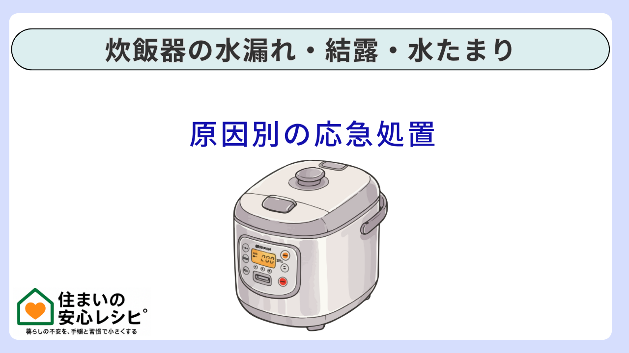 炊飯が終わって片付けようとしたら、炊飯器の下に水たまりがある。棚板が濡れていて、木がふやけそう。フタの周りがびしゃびしゃで、ポタポタ落ちる。あるいは、蒸気が出た後に「結露かな」と思って拭いたら、翌日もまた濡れている。こういう状況に直面すると、「壊れた?」「感電しない?」「火事にならない?」と一気に不安が押し寄せます。その気持ち、痛いほどわかります。