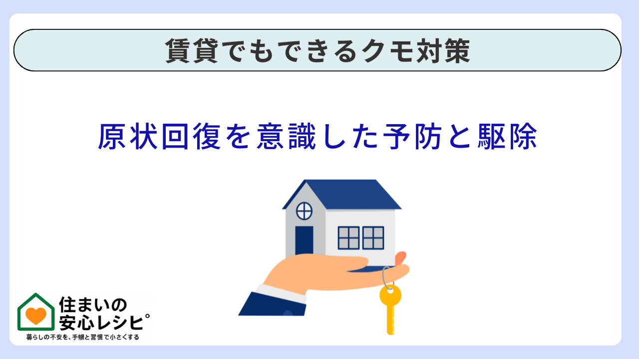 賃貸でもクモ対策はできます。ポイントは、第一に捕獲と清掃で今いる不安を減らすこと。第二に角の埃の膜を取って巣の足場を消すこと。第三に排水・ゴミ・段ボールなど餌の虫の発生源を止めること。第四に剥がせる素材で侵入口を減らし、換気はメッシュで守ること。そして、固定施工が必要になったら、早めに管理会社へ相談する。これが、原状回復を守りながら、現実的に再発を減らす設計です。