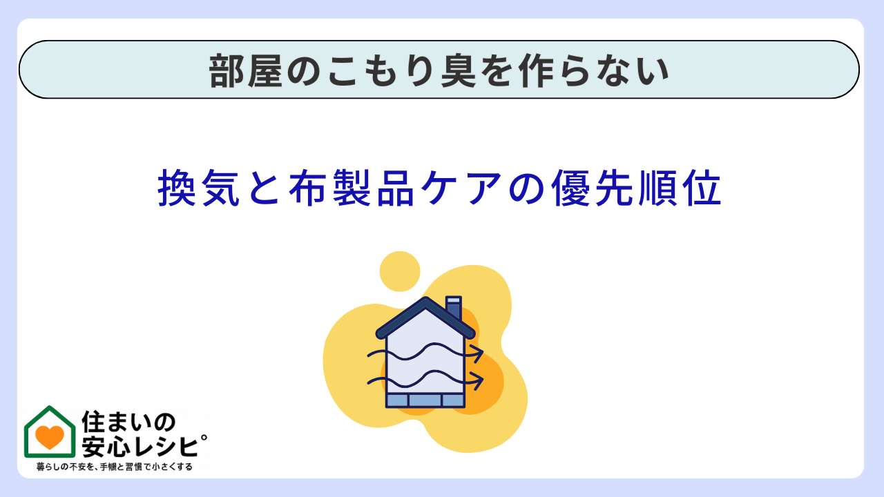 こもり臭対策の優先順位は明確です。第一に、換気は“窓を開ける”ではなく“入口と出口を作る”こと。第二に、匂いを抱え込む布製品のケアです。ここを逆にして、布用スプレーだけを撒いても、原因が残りやすいです。