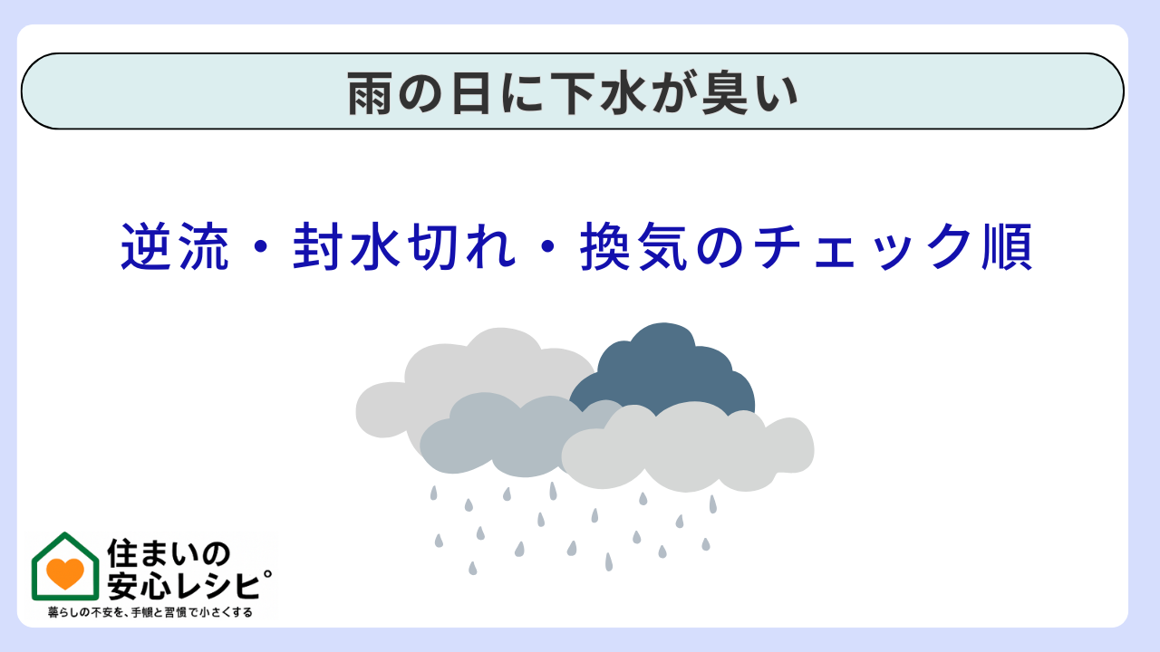 雨の日に下水臭が強くなるのは、雨で下水側の負荷と圧力が変動し、封水が弱い場所や換気の負圧がある場所から臭気が漏れやすくなるためです。まず逆流や詰まりの兆候を確認し、次に封水を補充して変化を見る。最後に換気扇による負圧の影響をテストし、給気の入口を整える。この順番で進めると、二度手間が減ります。