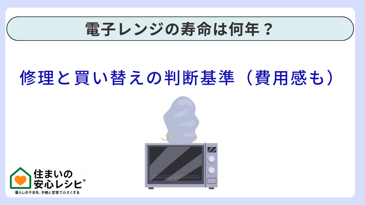 電子レンジの寿命は、目安として7〜10年と言われることが多いものの、実際は使い方と環境で大きく変わります。だからこそ、判断は年数だけでなく、症状の種類、危険サインの有無、修理費と買い替え費の比率で行うのが失敗しにくいです。