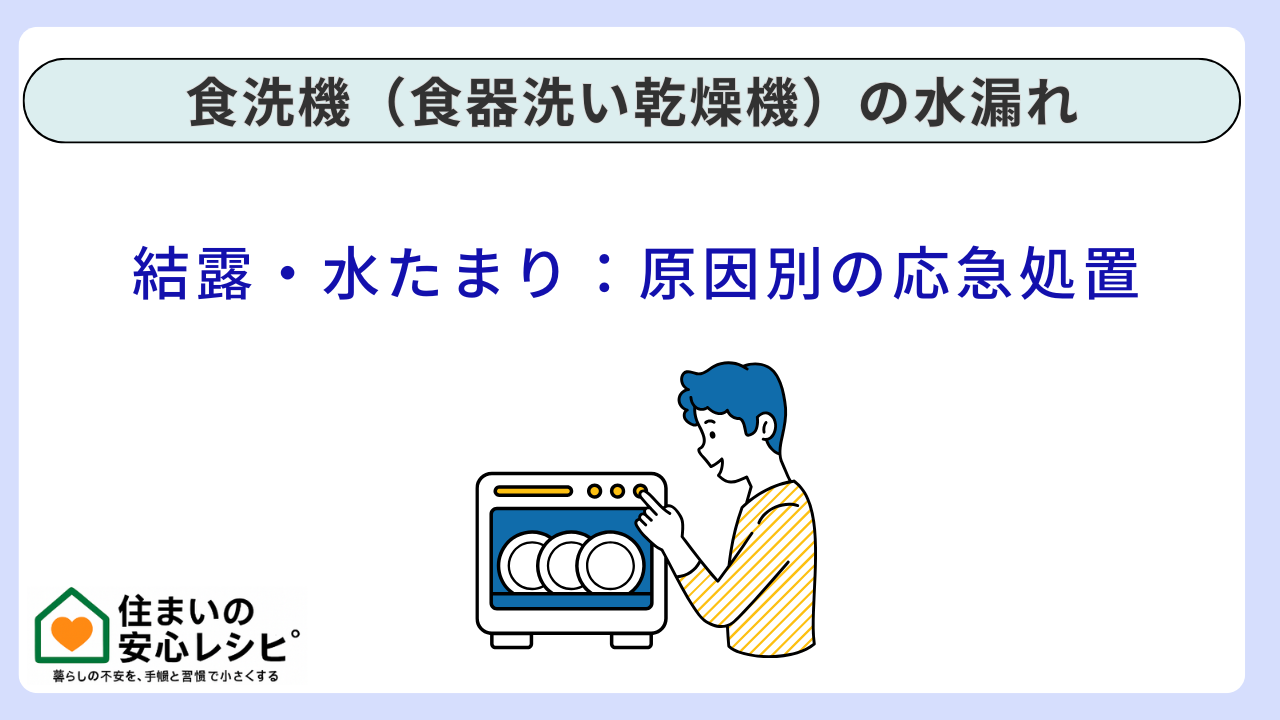 食洗機の前に立った瞬間、床がじっとり濡れている。マットの下が冷たく湿っていて、うっすら水たまりができている。扉を開けたら、庫内や扉の縁に水滴がびっしりで「結露かな?」と思ったのに、時間が経っても乾かない。そんな状況に直面すると、心臓がキュッと縮みますよね。「階下に漏れたらどうしよう」「電気が危ない?」「今すぐ業者? でも夜だし…」。その気持ち、痛いほどわかります。